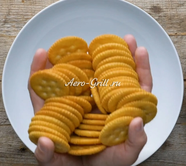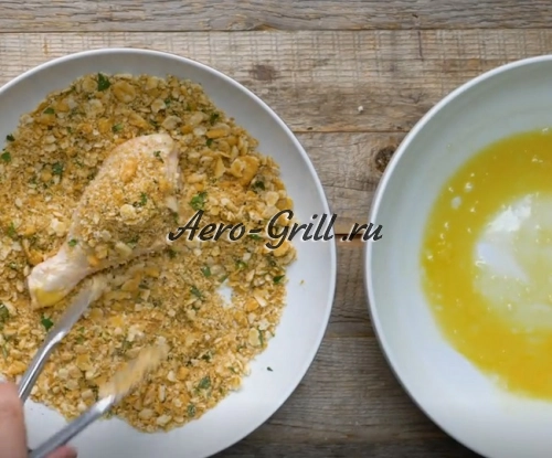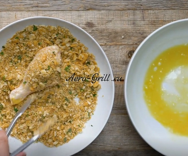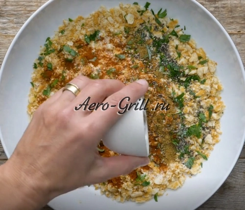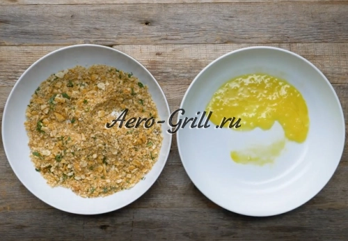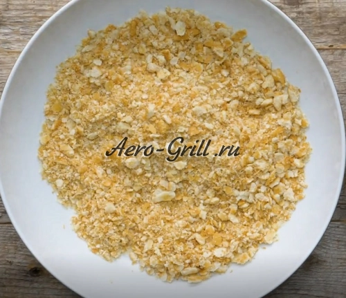Разогрейте аэрогриль до температуры 190 °C. Тем временем подготовьте панировку — раскрошите крекеры до мелкой крошки.