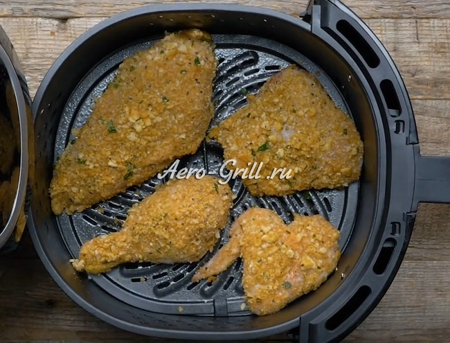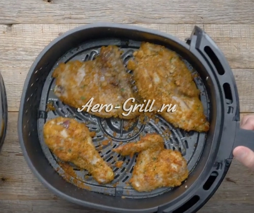 Разложите подготовленные кусочки курицы в один слой на слегка смазанной маслом решётке корзины аэрогриля и немного сбрызните их кулинарным спреем. Готовьте примерно 10 минут.