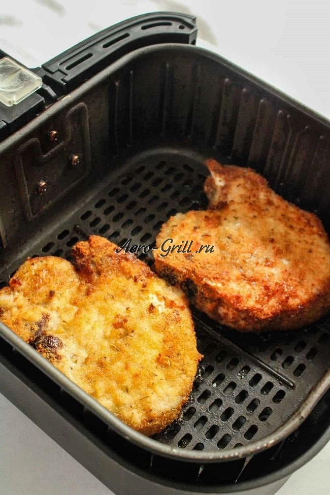 Разложите свиные вырезки на кости, покрытые панировкой, в корзине аэрогриля в один слой, чтобы воздух свободно циркулировал между кусками. Готовьте мясо около 14–16 минут.
