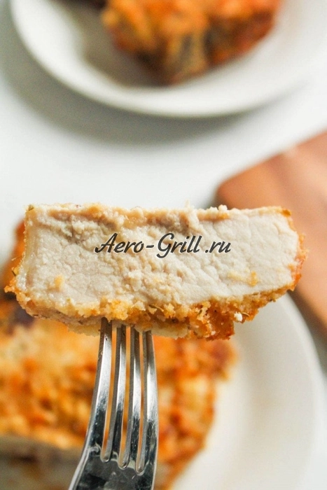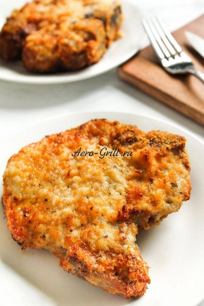 Свиная вырезка на кости, запечённая в аэрогриле, обваливается в хлебных сухарях, благодаря чему приобретает аппетитную хрустящую корочку, сохраняя при этом нежность и сочность мяса внутри.
